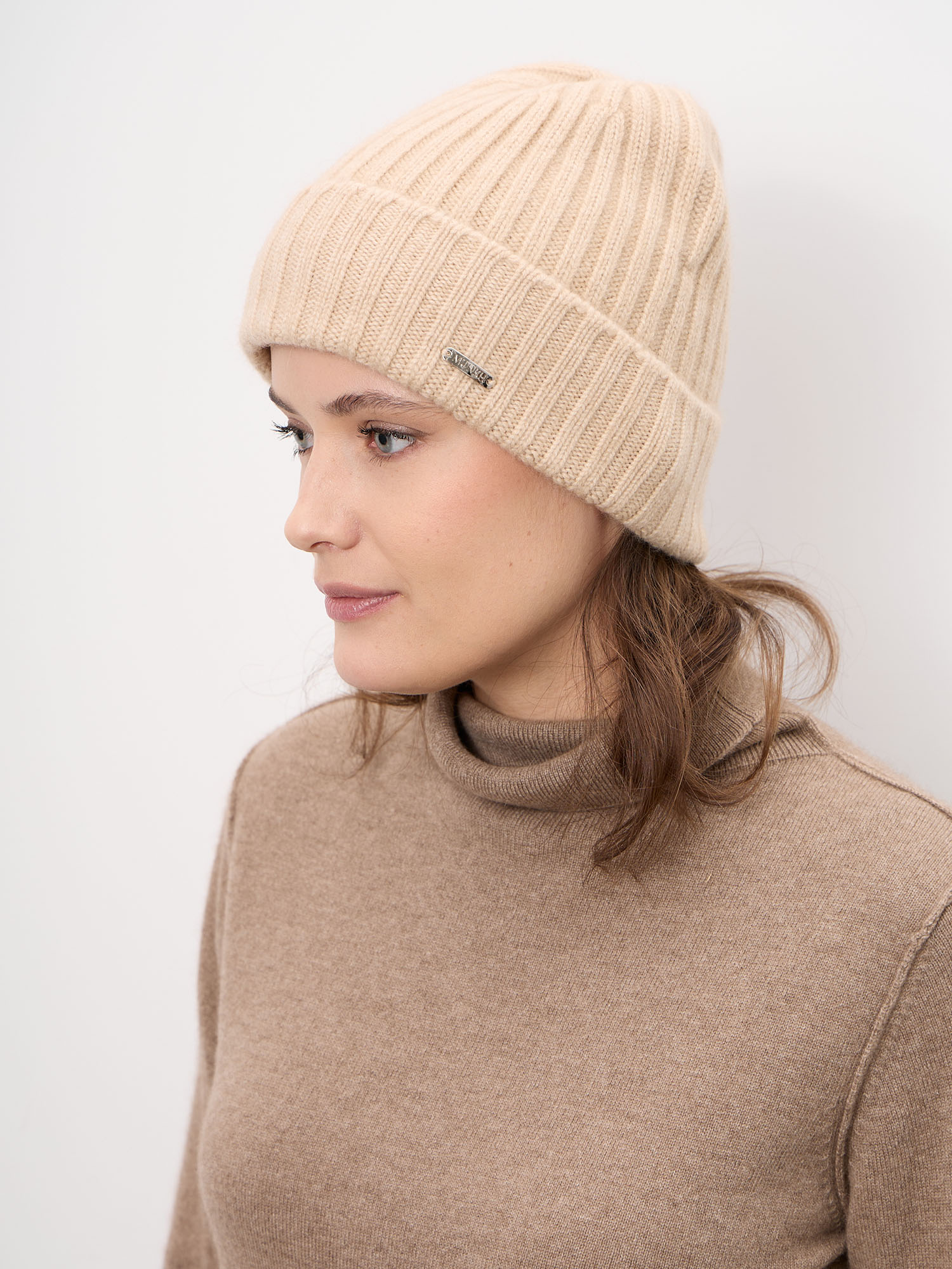 Лаконичная женская шапка из натурального кашемира — идеальный выбор для холодного сезона. Модель выполнена в универсальном бежевом оттенке, который легко сочетается с базовым и классическим гардеробом. Мягкая фактура и аккуратная форма обеспечивают комфортную посадку и элегантный внешний вид.