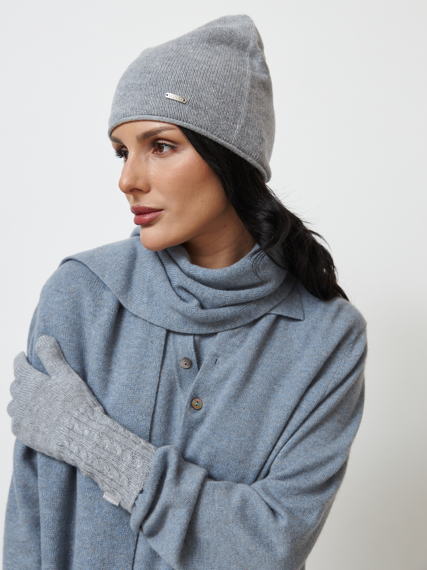 Тонкое волокно обеспечивает исключительную мягкость без колкости. Кашемир обладает природной терморегуляцией — сохраняет тепло в холодную погоду и поддерживает комфорт в помещении. Материал гипоаллергенный, лёгкий и при правильном уходе устойчив к деформации и образованию катышков.