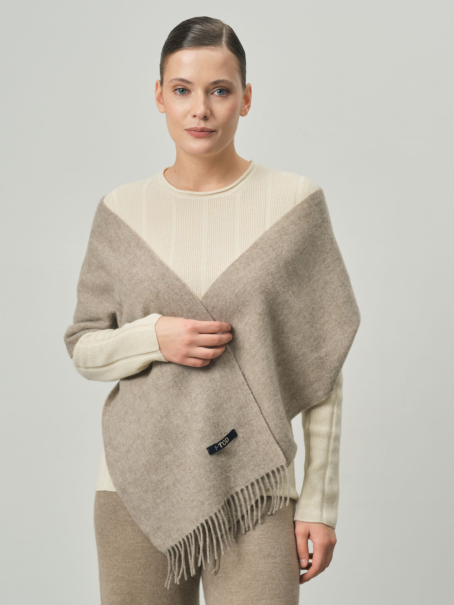 Классическая прямоугольная форма с лаконичной текстурой. Края украшены аккуратной бахромой, которая добавляет аксессуару лёгкость и завершённый вид.