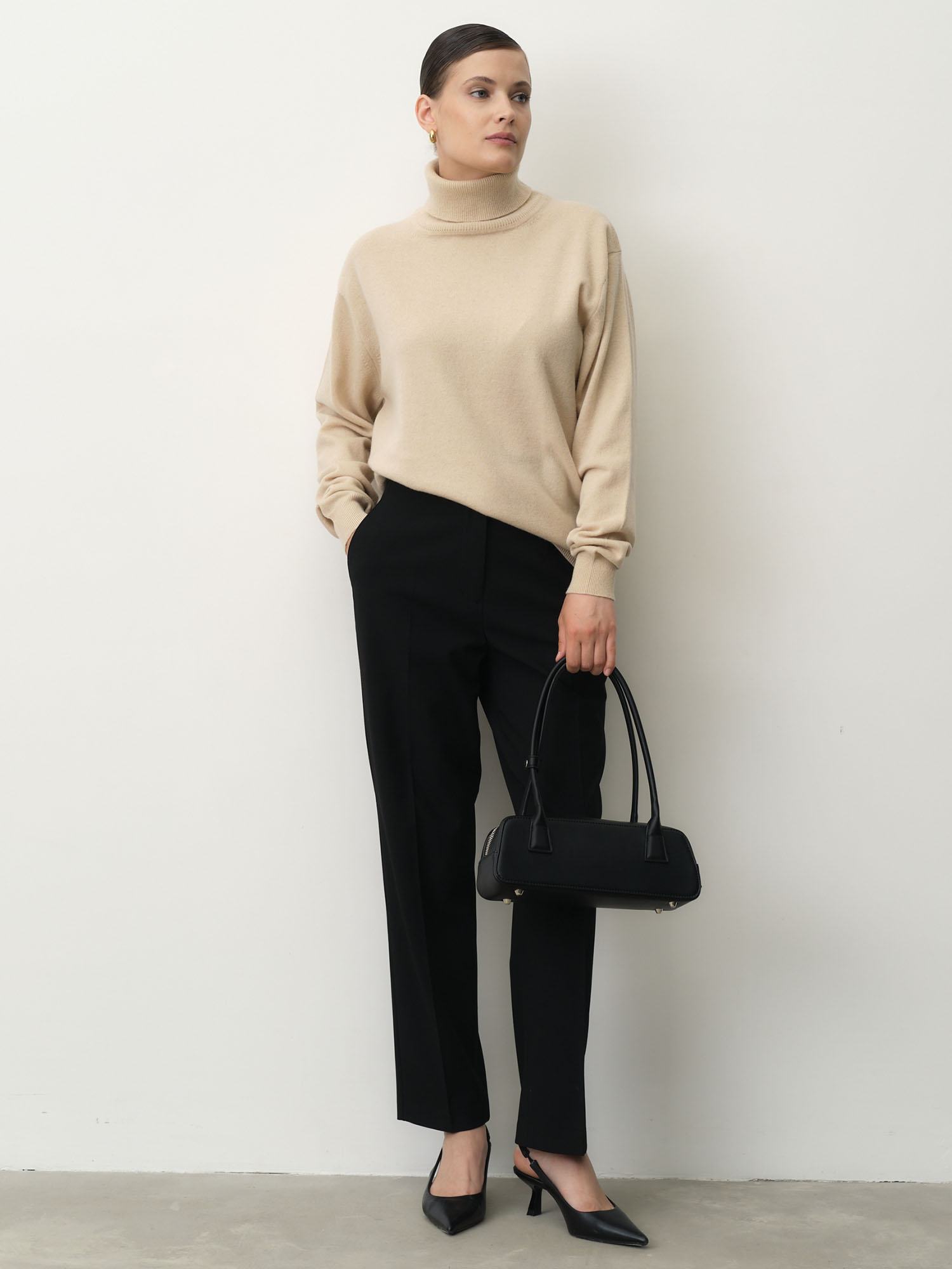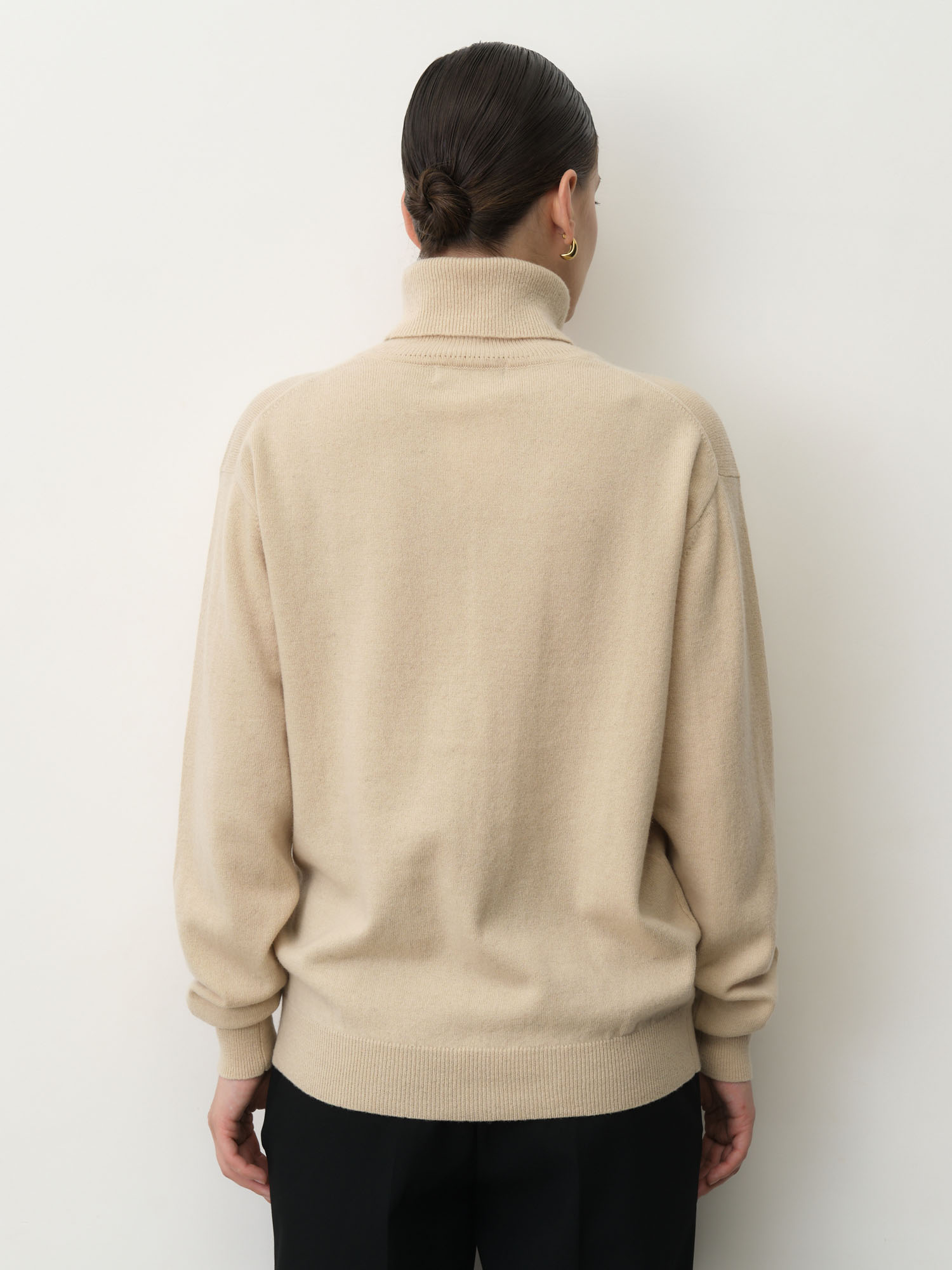 Модель выполнена с классическим высоким воротником и гладкой аккуратной вязкой. Лаконичный крой подчеркивает благородную текстуру материала и создаёт современный минималистичный силуэт.