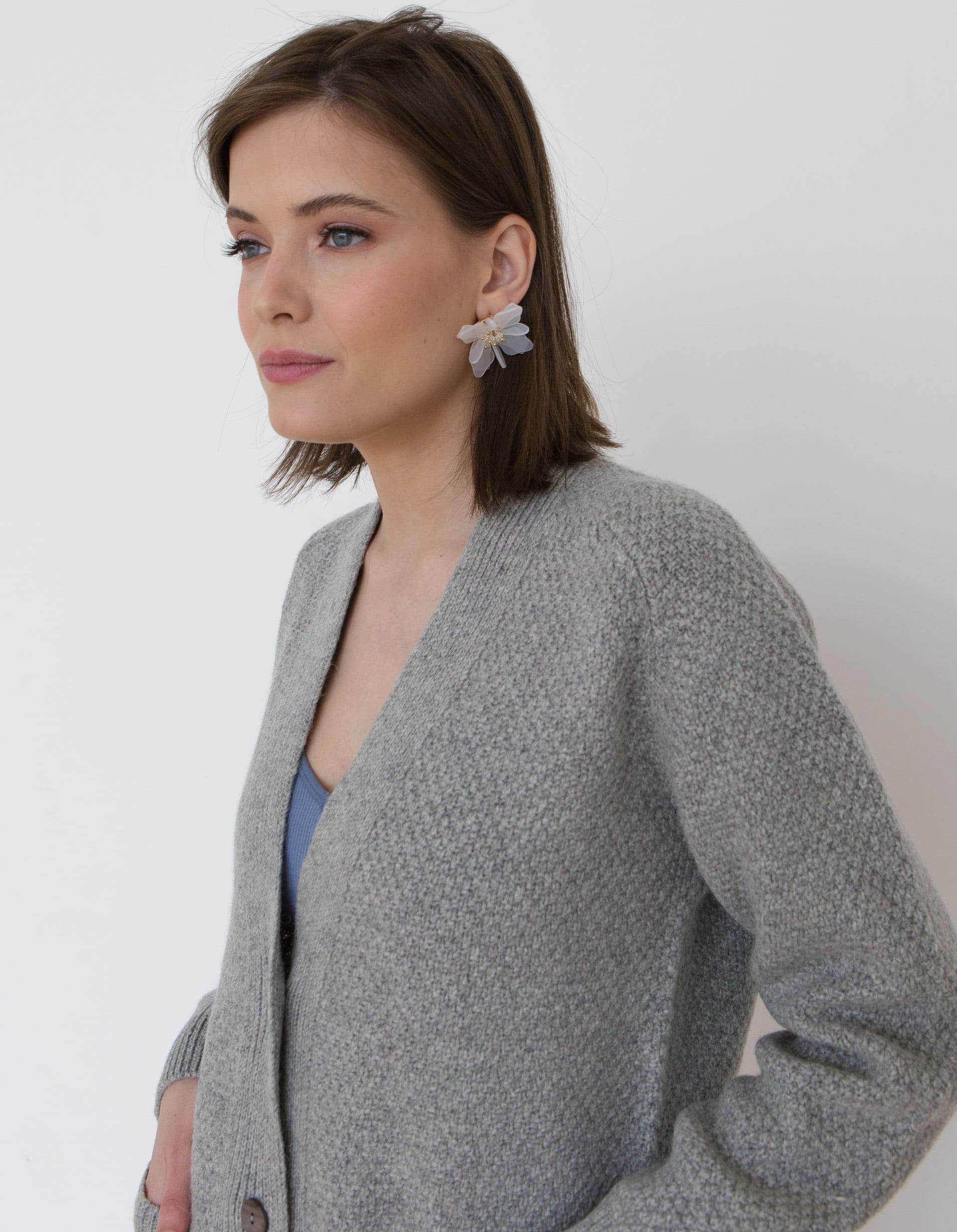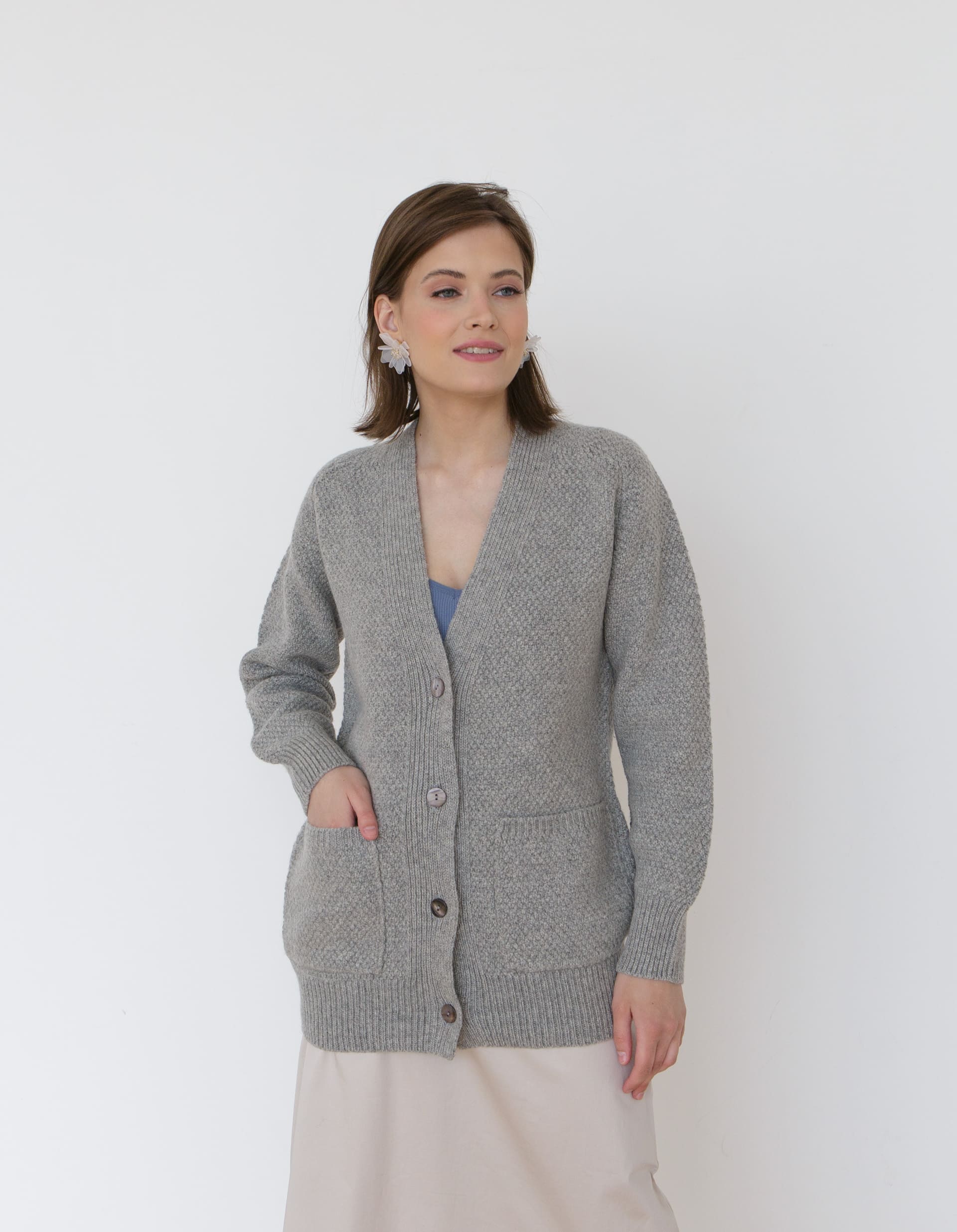 Модель выполнена в формате классического кардигана с V-образным вырезом и застёжкой на пуговицы. Универсальный крой позволяет носить изделие как самостоятельный элемент или как дополнительный слой в образе.