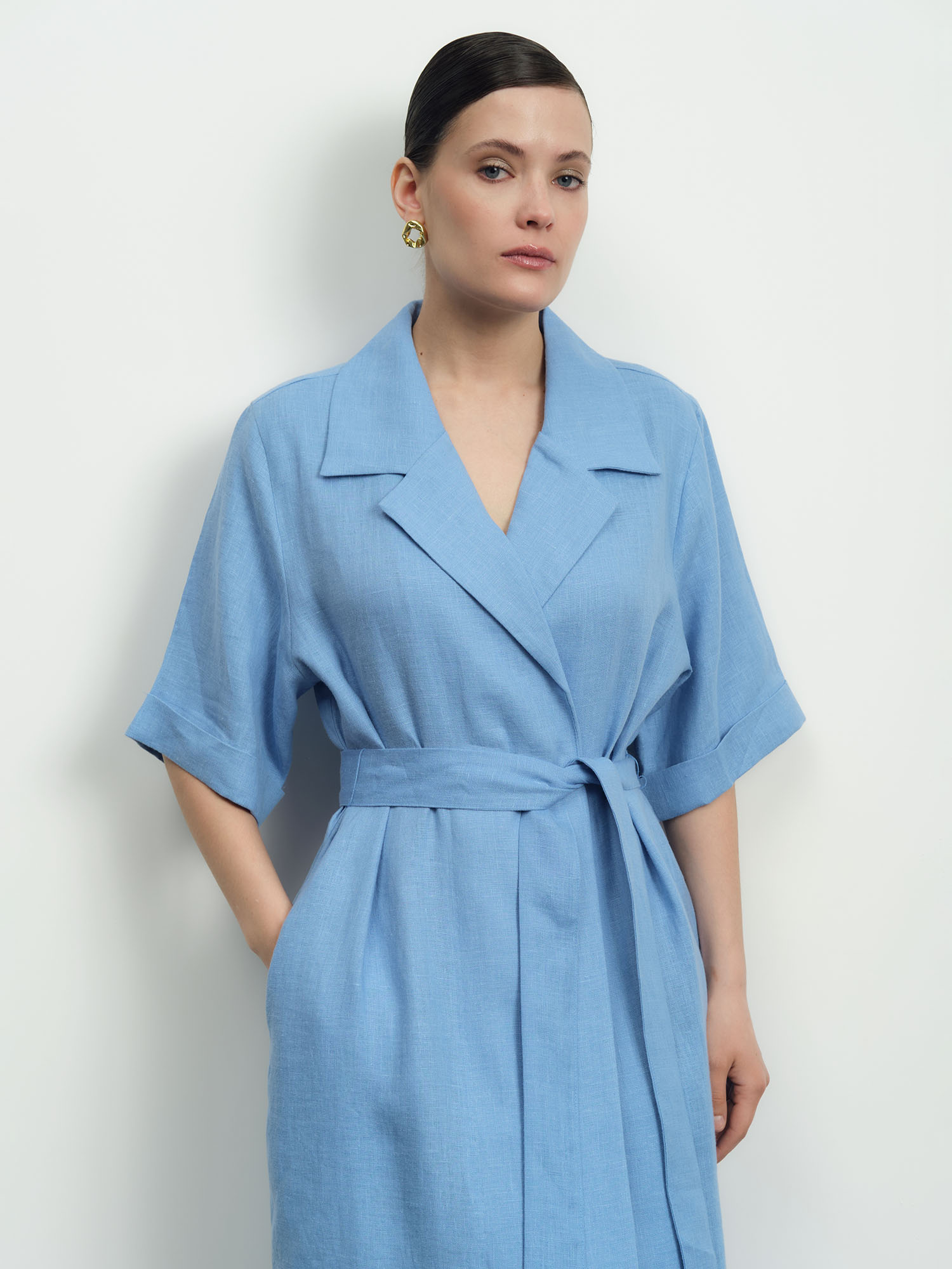 Запах с поясом для регулировки посадки, боковые карманы, аккуратный отложной воротник, мягкая фактурная ткань.