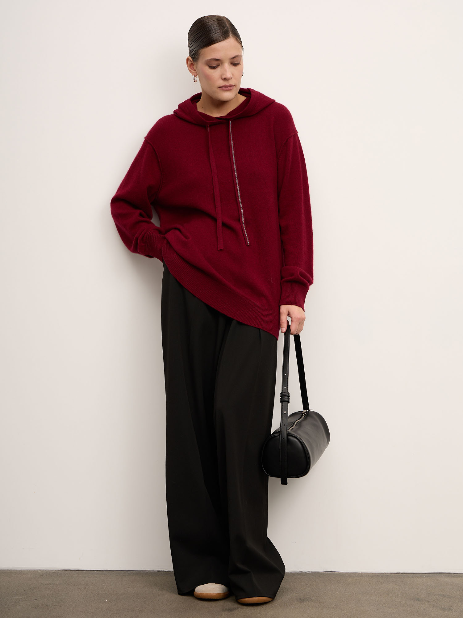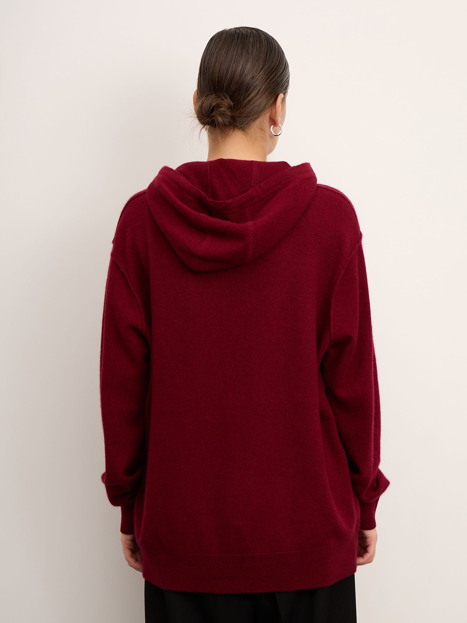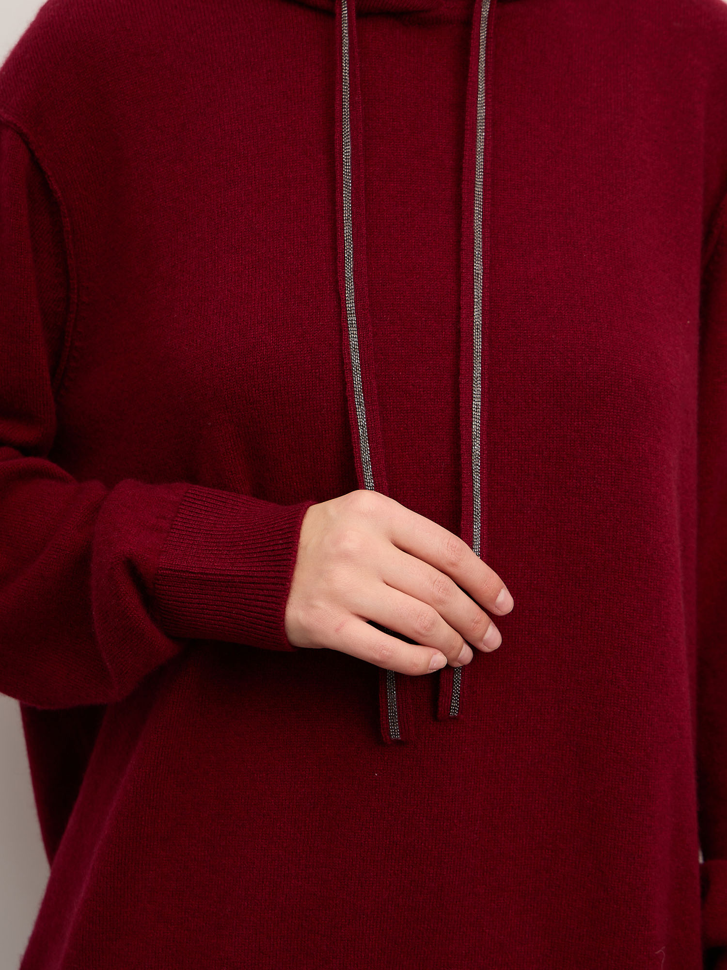 Объёмный джемпер с капюшоном из 100% монгольского кашемира в насыщенном оттенке бургунди — это сочетание уюта, современного кроя и безупречного качества. Мягкий, дышащий материал создаёт ощущение тепла и лёгкости, а глубокий винно-красный цвет придаёт образу выразительность и характер.