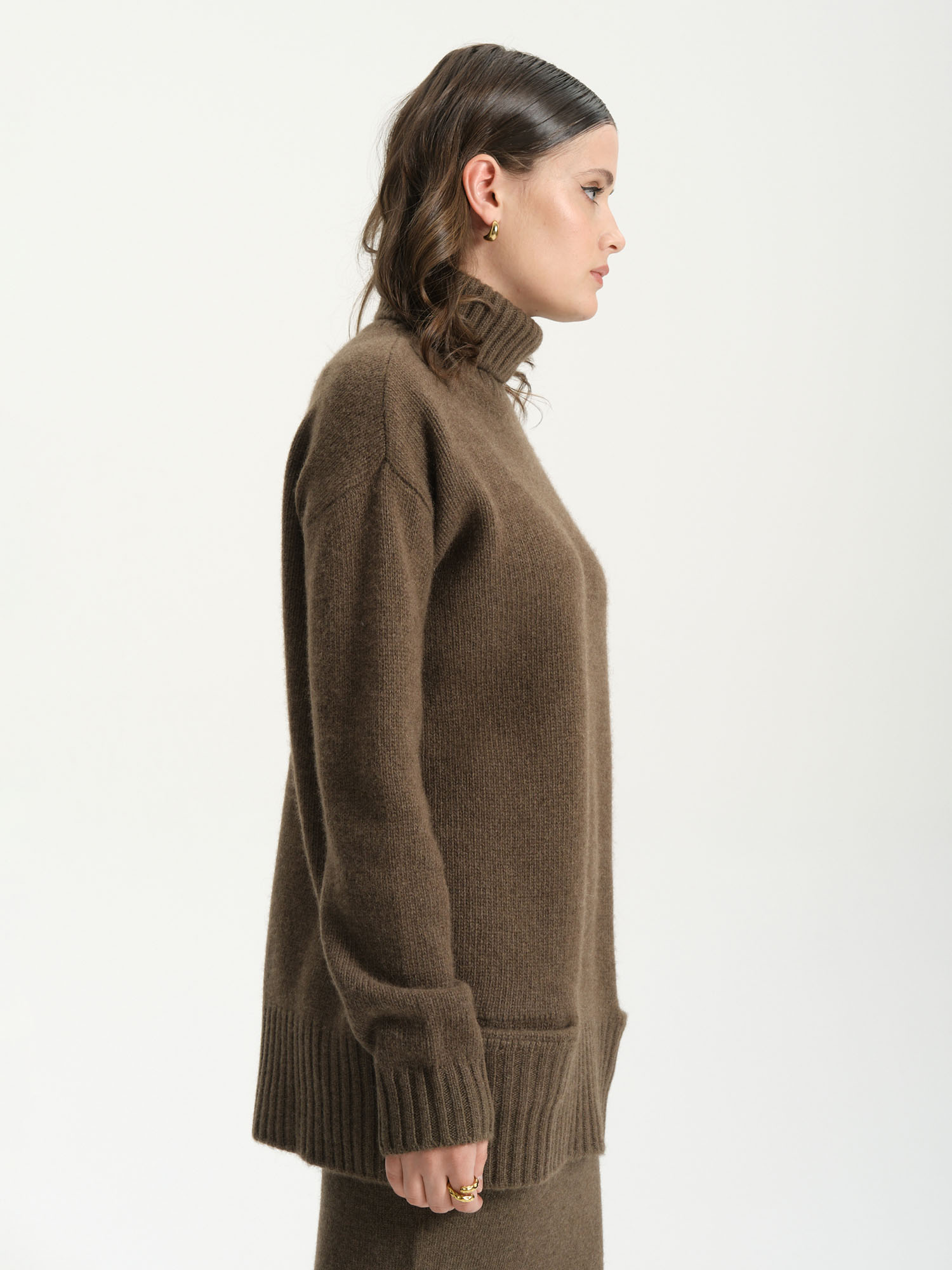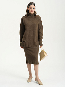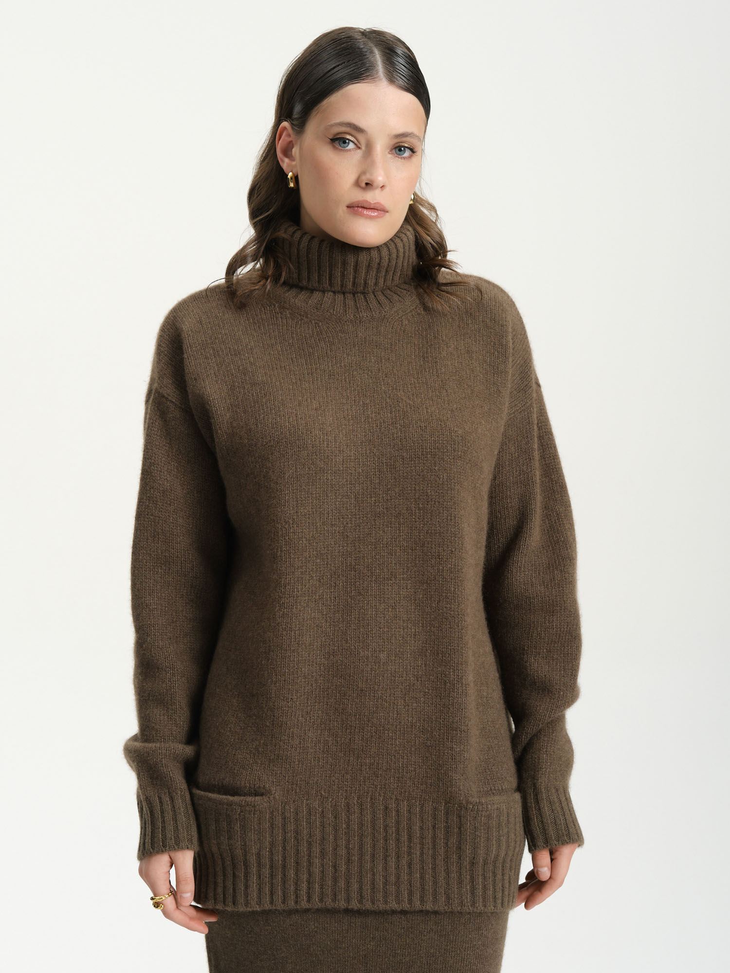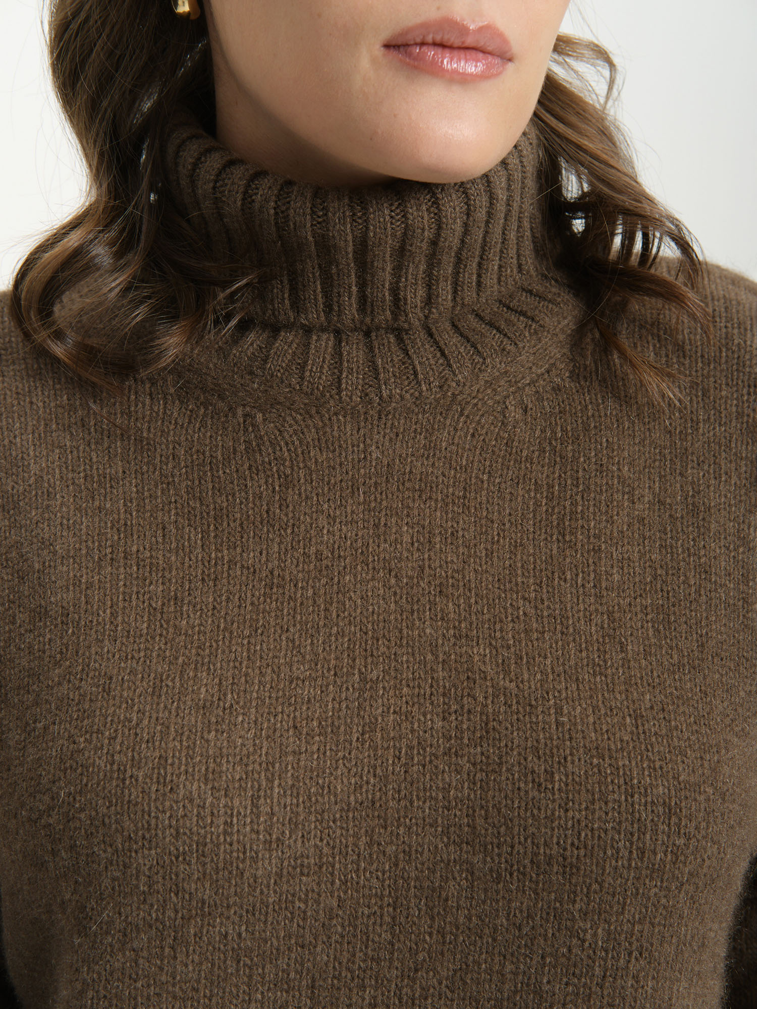 Модель выполнена с высоким воротником и классическим прямым силуэтом. Минималистичный дизайн подчёркивает натуральную красоту материала и делает свитер универсальным элементом базового гардероба.