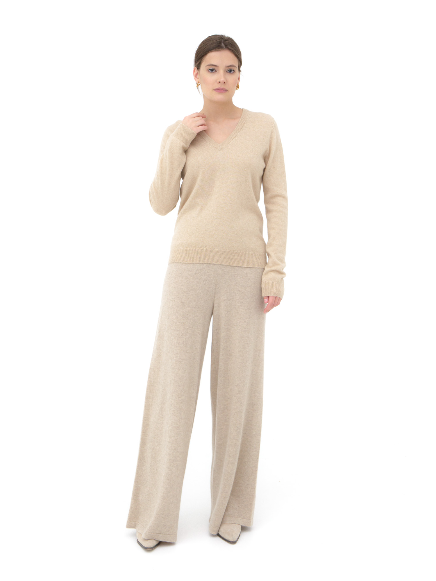 Модель выполнена в классическом прямом силуэте с аккуратным V-образным вырезом. Гладкая вязка подчёркивает благородную фактуру материала и делает изделие универсальным для разных стилей.