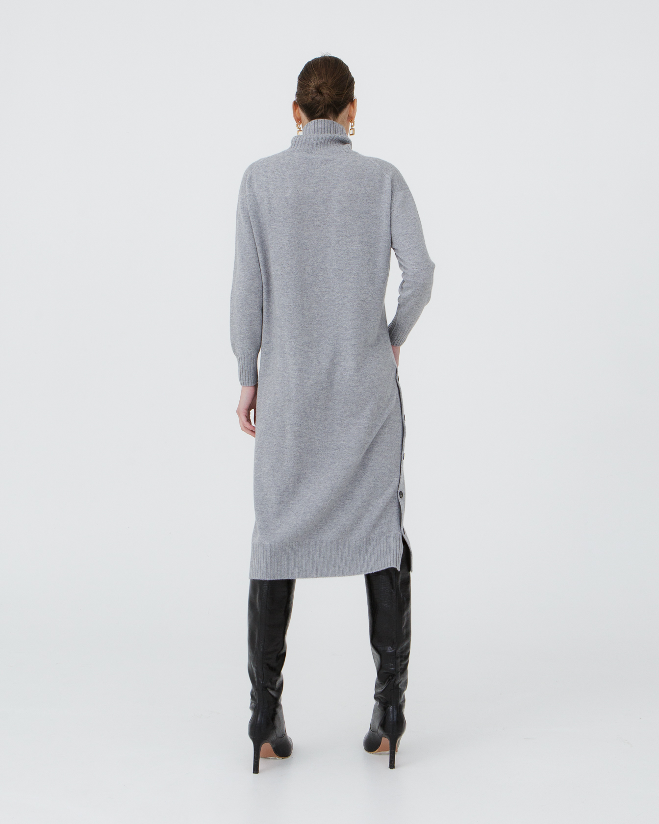 Элегантное кашемировое платье в серо-голубом цвете — воплощение утонченности и комфорта. Высокий воротник защищает от ветра, а длинные рукава и удлиненный крой дарят ощущение уюта и тепла в холодное время года. Мягкий кашемир обеспечивает приятные ощущения на коже, а спокойный оттенок идеально сочетается с любыми аксессуарами. Боковая линия с декоративными пуговицами придает изделию современный и стильный вид. Идеальный выбор для создания изысканного повседневного или делового образа.