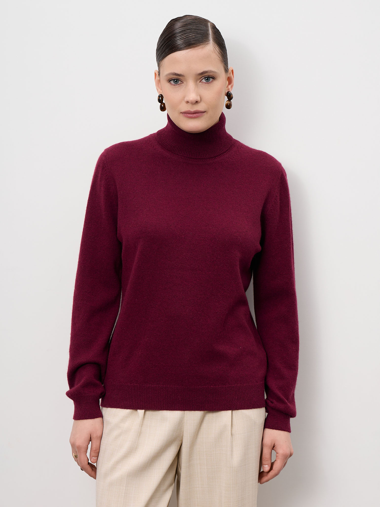 Элегантная женская водолазка из натурального пуха яка — базовая модель с благородным оттенком бургунди. Лаконичный дизайн и безупречная посадка делают её универсальной основой гардероба для холодного сезона.
