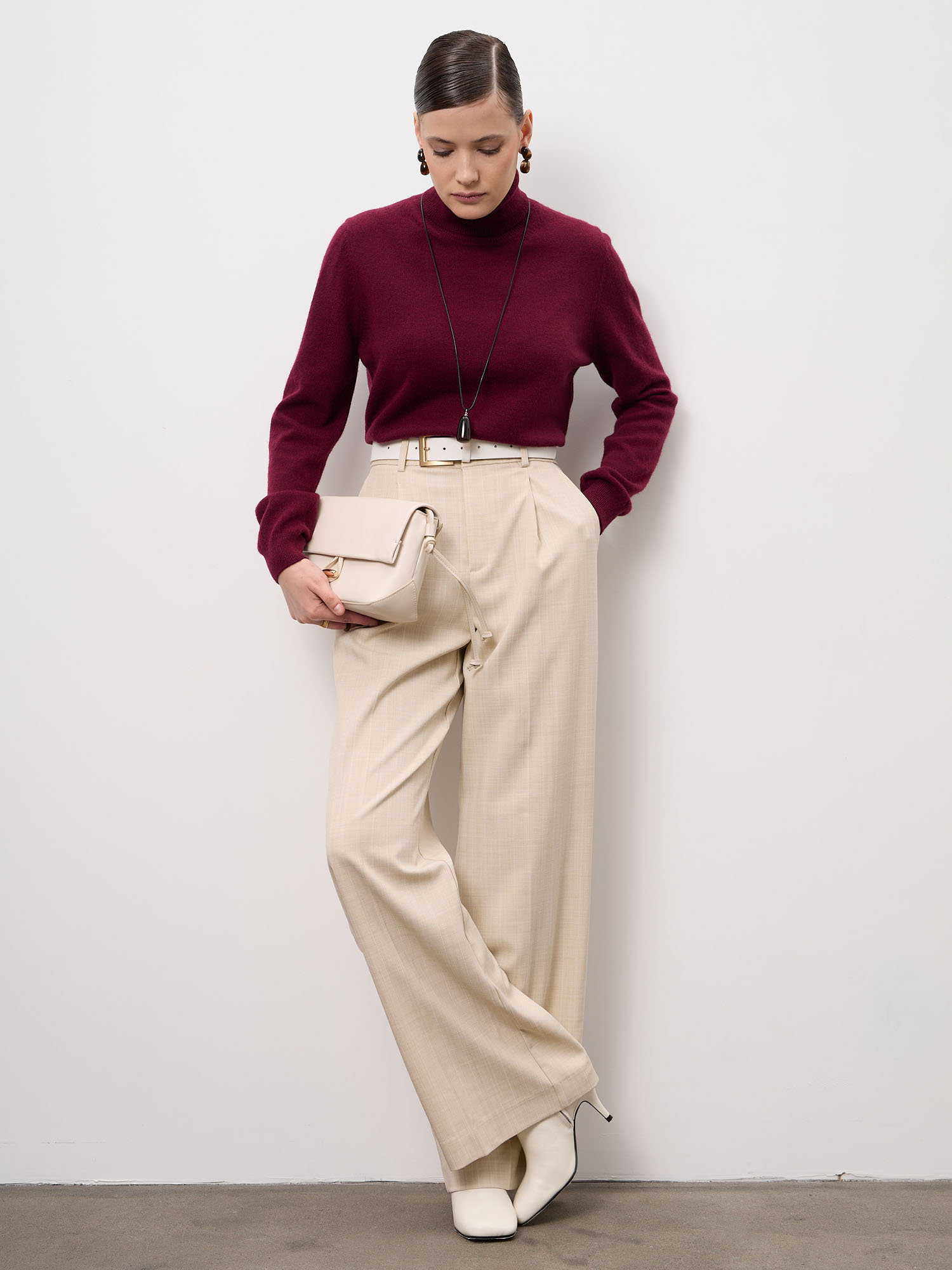 Бургунди — глубокий, насыщенный оттенок, который добавляет образу выразительности и легко сочетается с нейтральной и светлой палитрой.