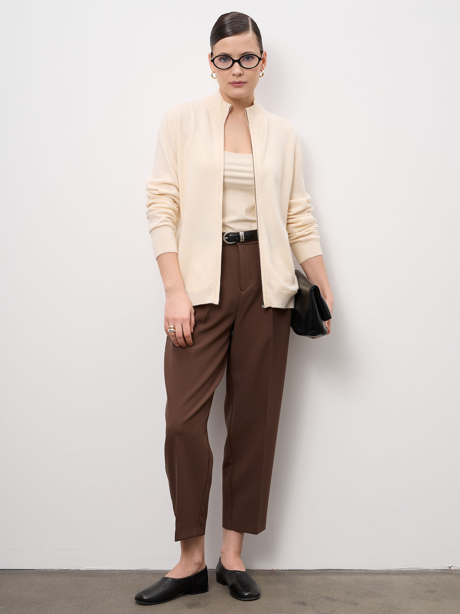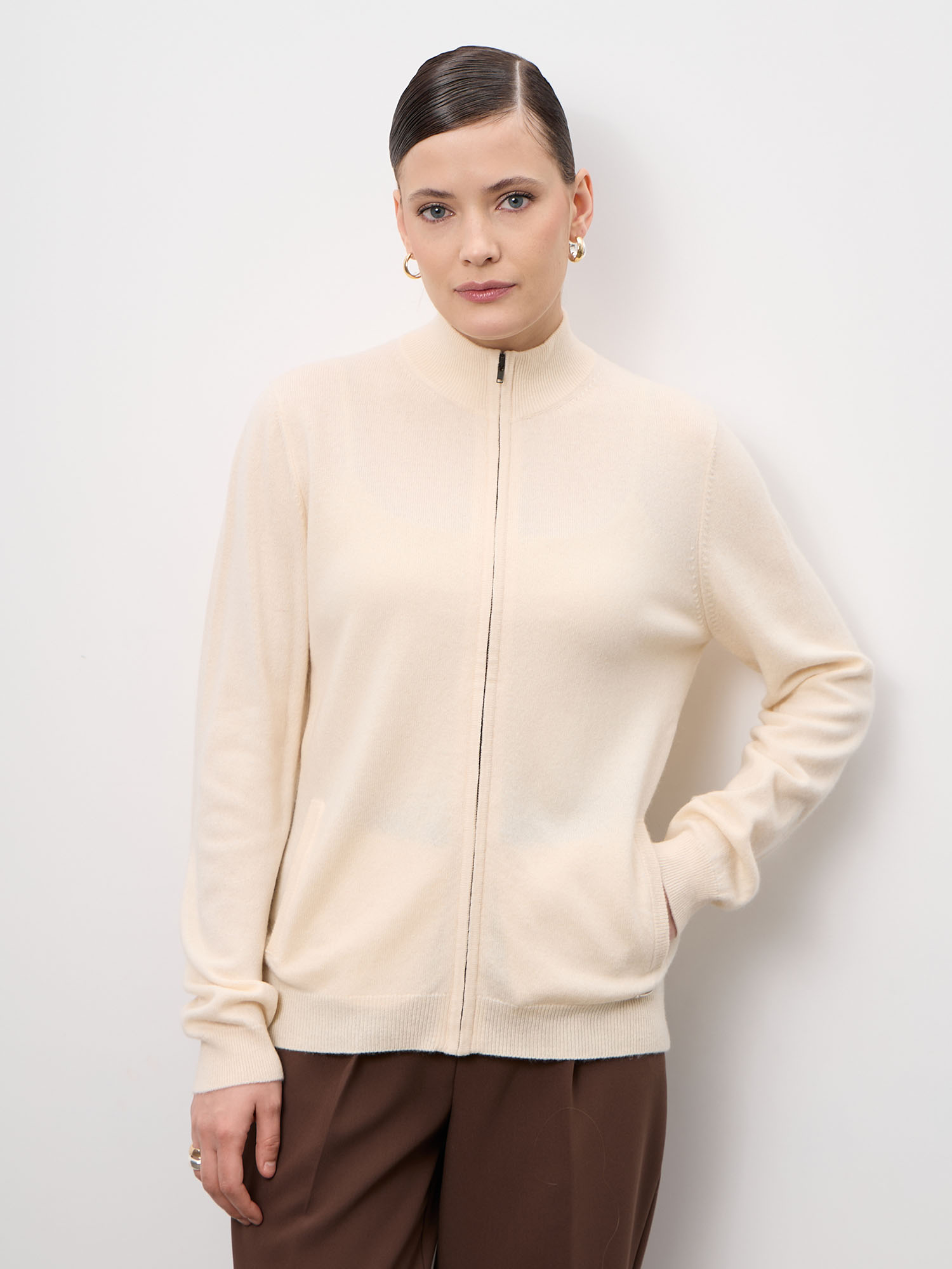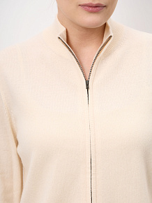 Элегантный кардиган из натурального кашемира — универсальная модель для создания спокойных, утончённых образов. Кремовый оттенок подчёркивает мягкость материала и легко сочетается с базовым гардеробом. Кардиган подходит как для повседневных, так и для более аккуратных офисных комплектов.